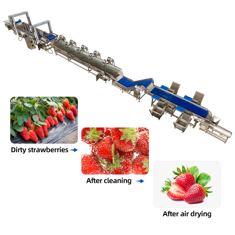 Bubble washing + rotating roller air drying protects delicate fruits such as strawberries, minimizing breakage.